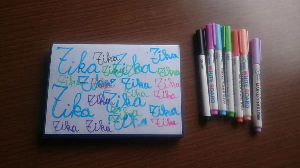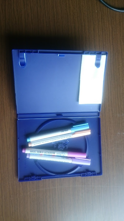 Maar we kunnen natuurlijk niet alles zomaar 10 maand laten liggen. Ik maakte vandaag alvast een whiteboard van een oud DVD doosje. In het hoesje kunnen verschillende papieren: ruitjes, schoon schrift, … In het doosje zitten stiften en een vodje.