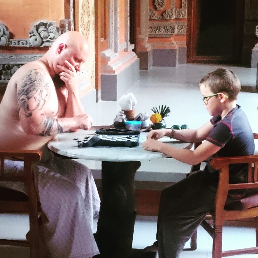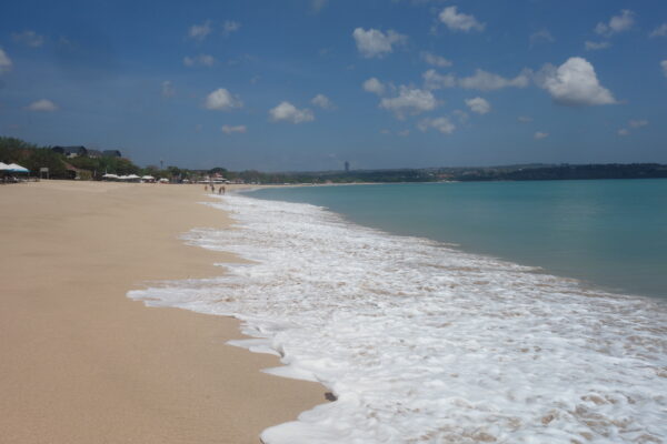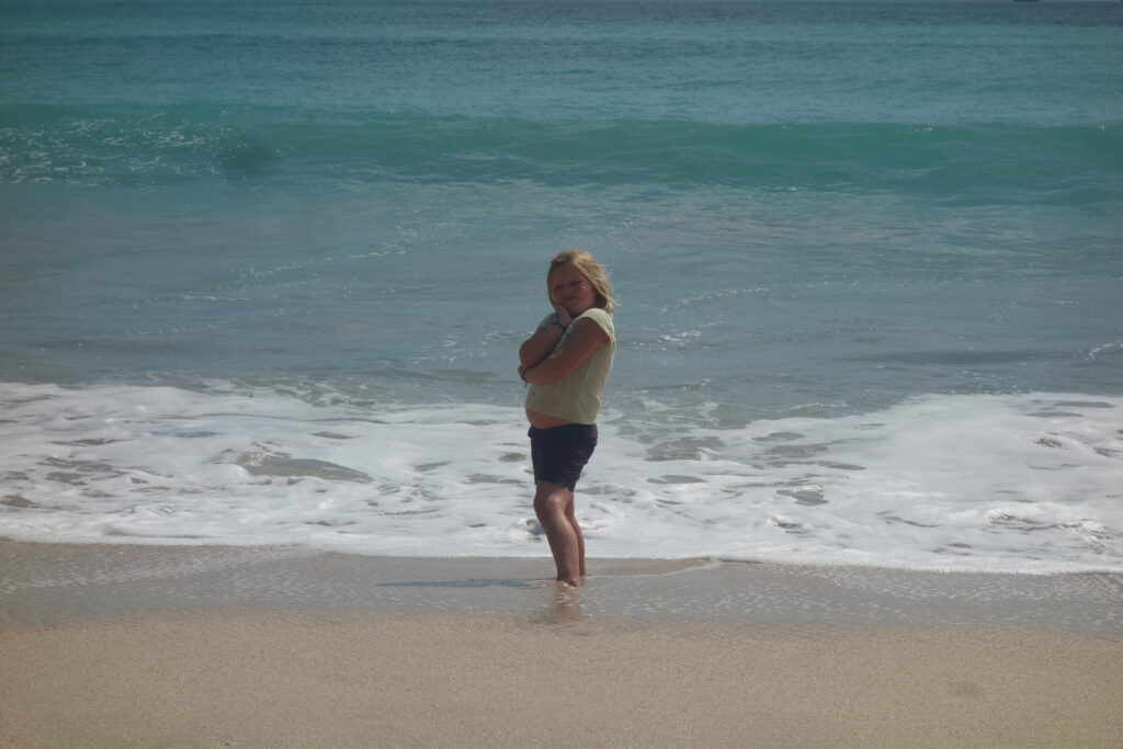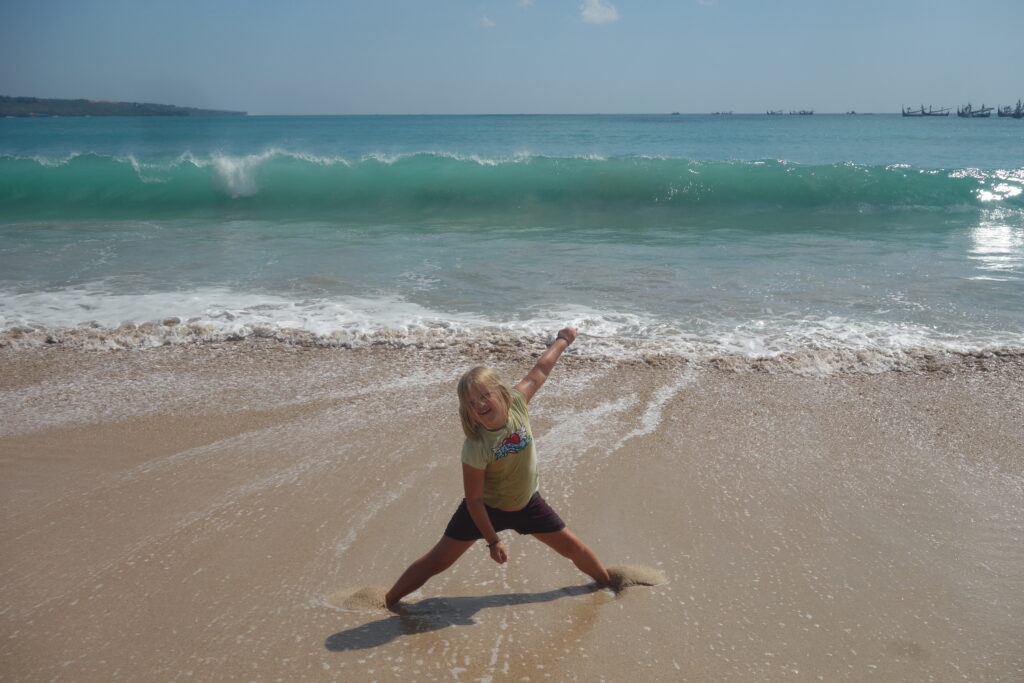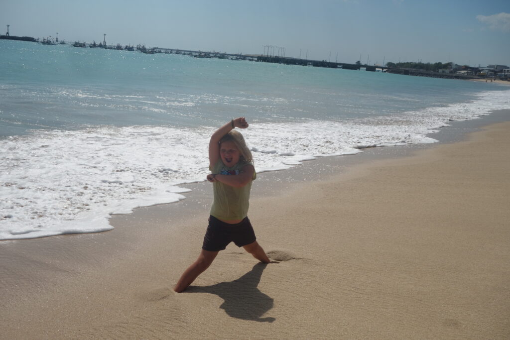 Onze eerste dag in Bali stond het waterpretpark Water Bom op ons programma. Dit waterpark zou toffer moeten zijn dan de aquaparken van Walibi, Plopsa en Bellewaerde samen. Maar eigenlijk zijn we allemaal te moe voor een dagje fun en besluiten we niet te gaan. Ons hotel heeft ook een zwembad en dus besluiten we daar maar een duikje te nemen. ‘s Middags genieten we van een overheerlijke schotel zeevruchten aan het strand van Jimbaran. Bernie en Kiran genieten van het zicht op zee, terwijl Tika en ik een wandeling maken met onze voeten (en uiteindelijk onze broek) in het water.