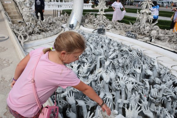 De eerste dag bezoeken we de Wat Rong Khun, beter gekend als witte tempel. Deze tempel is nog maar een goede twintig jaar oud, maar is toch al uitgegroeid tot een van de belangrijkste trekpleisters van het noorden. De tempel, zoals de naam al doet vermoeden, is helemaal wit en daardoor prachtig. Het is eigenlijk niet alleen een tempel, maar vooral ook een kunstwerk. Om in de tempel te geraken moet je over een brug die gebouwd is over de ‘put van de hel’ vol mensenarmen om zo in het hiernamaals te geraken. Ook binnenin vind je prachtige kunstwerken. Na een plasje in het duurste toiletgebouw van Thailand, keerden we weer huiswaarts.