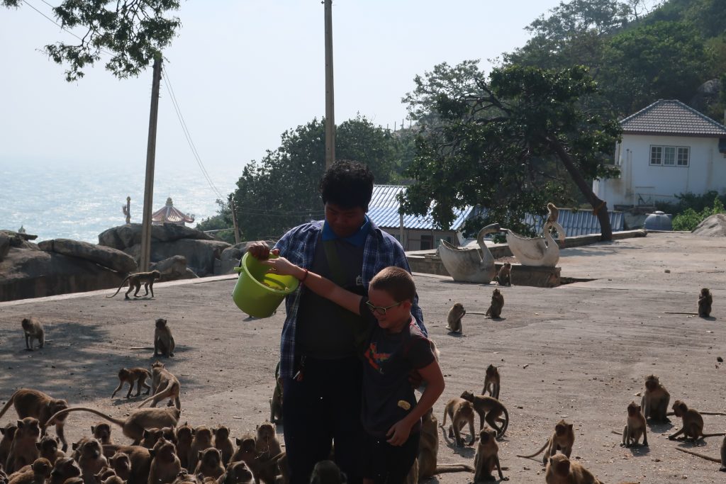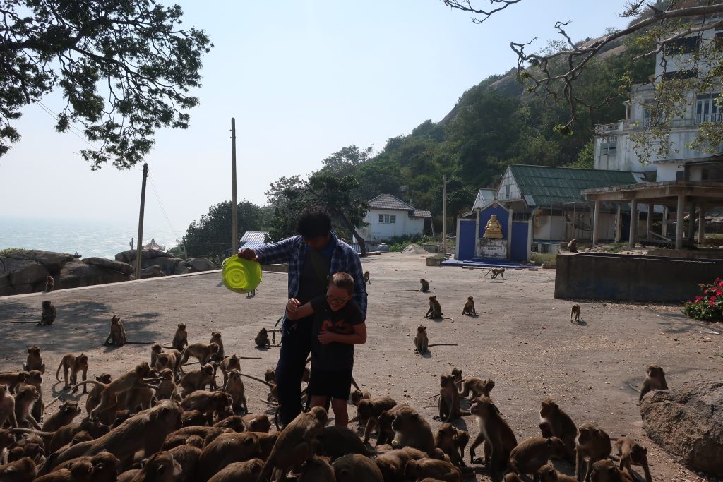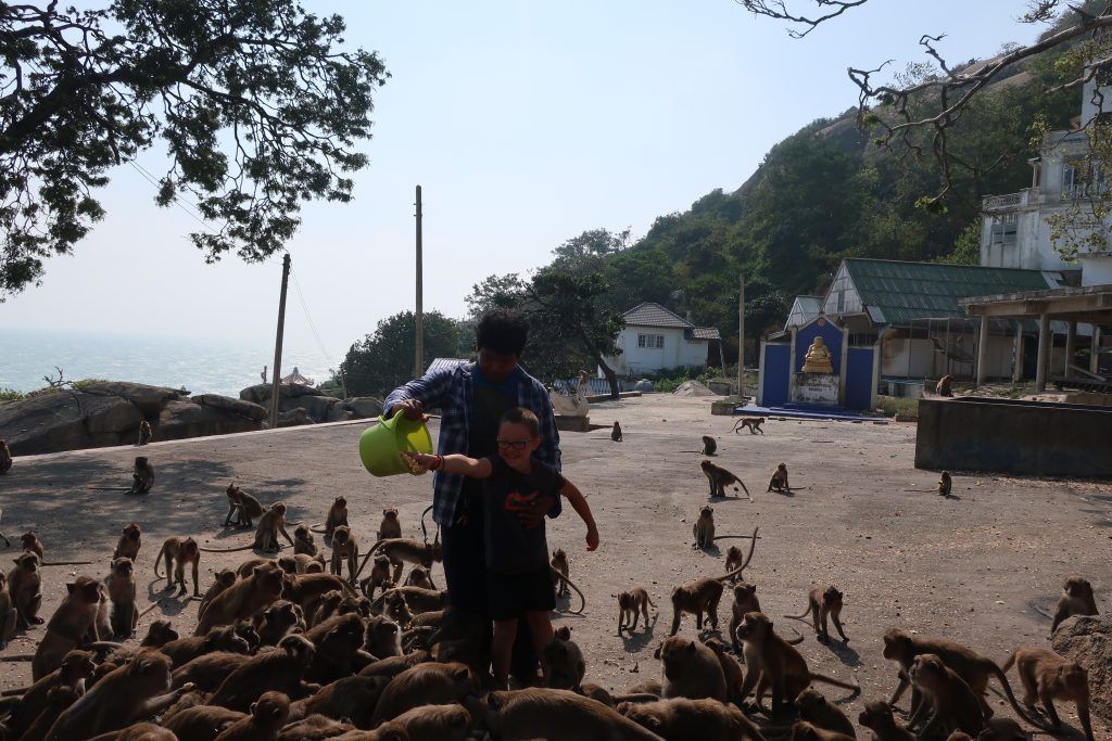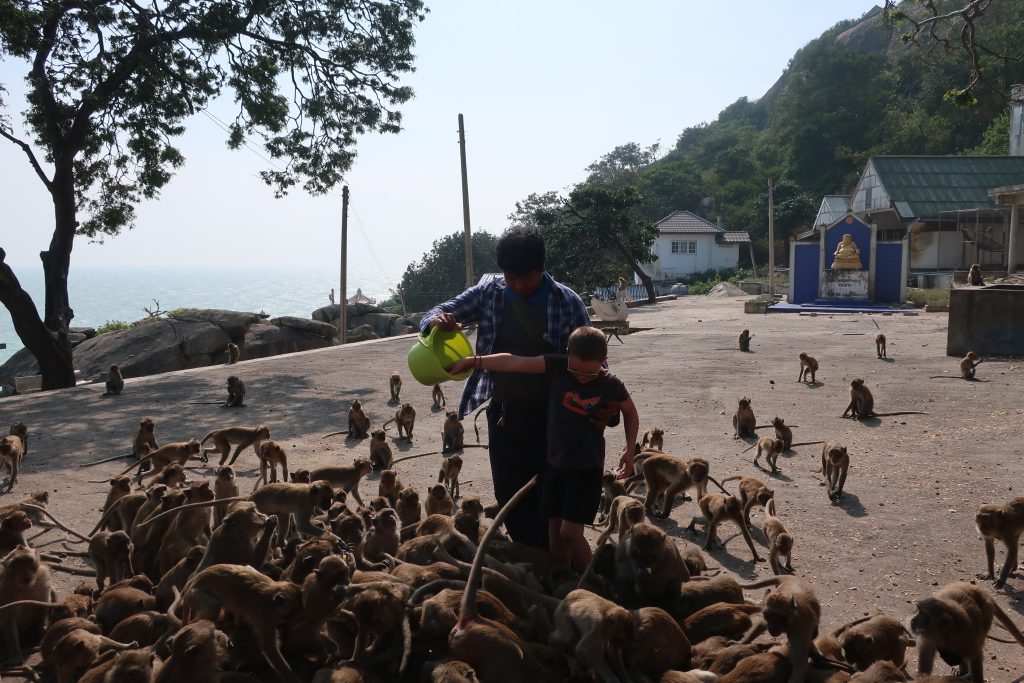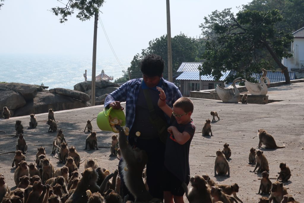 Daarna trekken we met z’n allen richting kust, om nog enkele dagen uit te waaien. We verblijven in een groot huis vlak bij het strand. Airco hebben we niet nodig, want er waait een fris windje. Naast de vele strandwandelingen, schelpjes zoeken en genieten van strandbars bezoeken we ook de vismarkt en de apentempel. De tempel staat op de top van een hoge rots vanwaar we een prachtig uitzicht hebben en het krioelt er van de apen. Ze verkopen ook eten dat je aan de aapjes mag geven. Daar kunnen we natuurlijk niet aan weerstaan! Kijk maar op de foto’s hoe Kiran geniet!