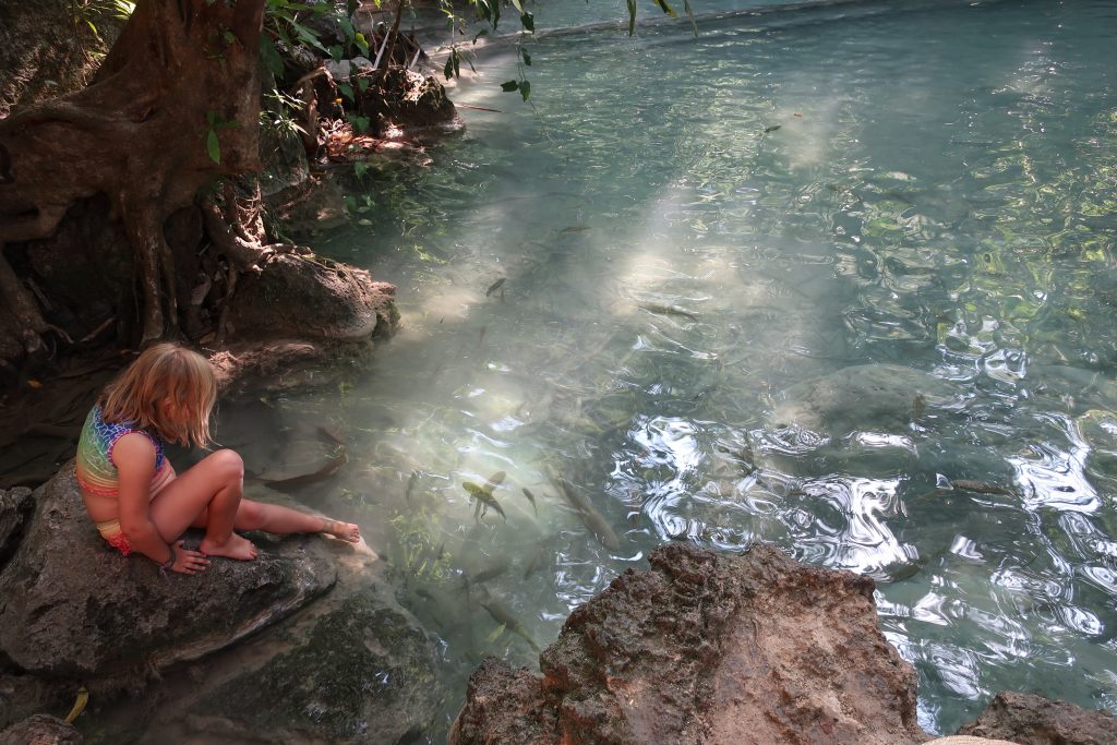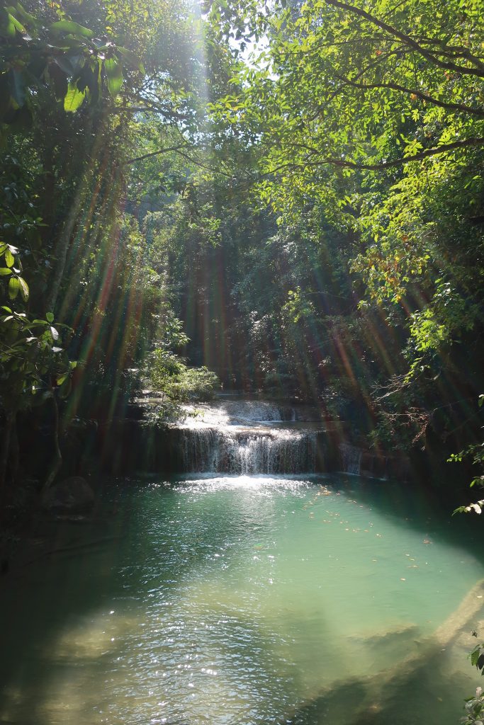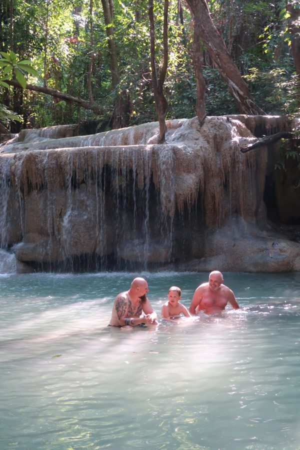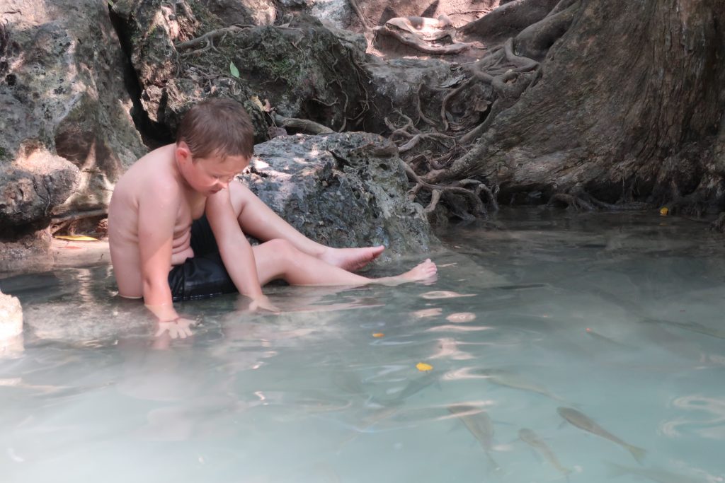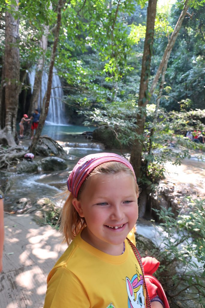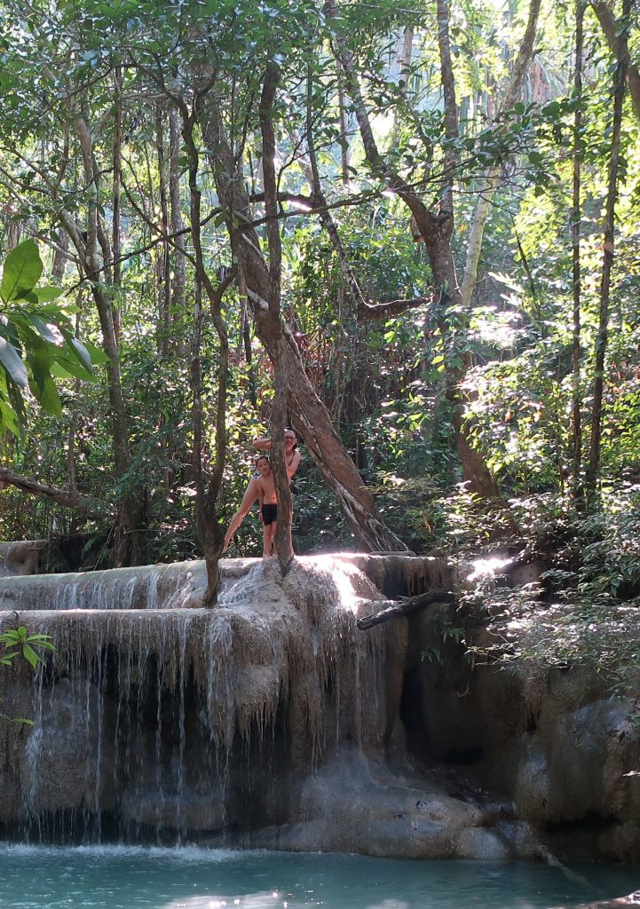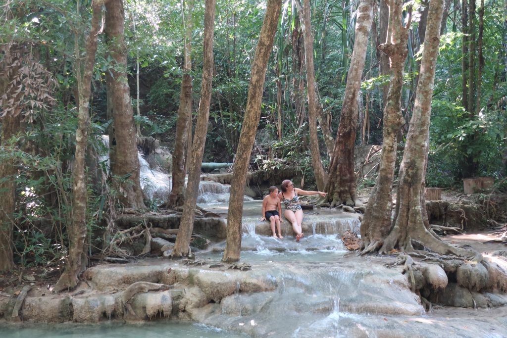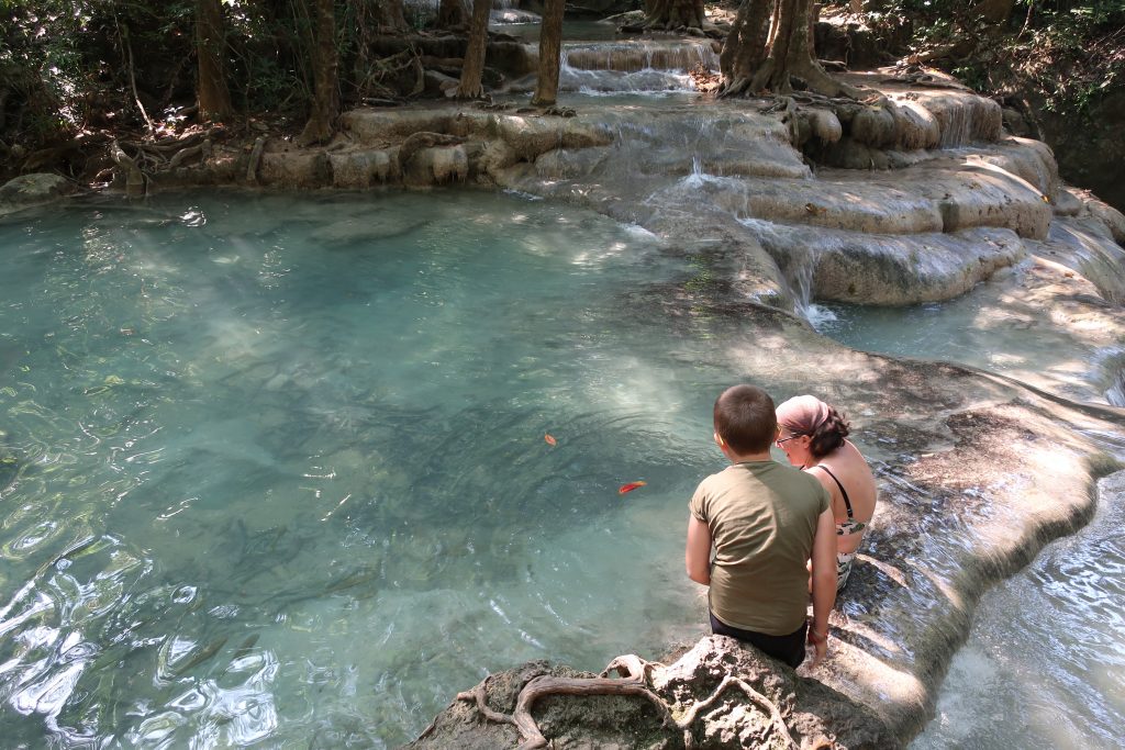 Daarna trokken we naar de mooiste watervallen die we tot nu toe gezien hebben: de Erawan Waterfalls. Vooral de prachtige kleur van het helderblauwe water tussen het groene woud kan ons bekoren. De waterval bestaat uit zeven verdiepingen die we te voet naar boven moeten klimmen. Het is er redelijk druk, maar toch vind je er rustige plekjes waar je helemaal alleen kan zijn. Op de vijfde verdieping pauzeren we om te zwemmen. In het begin durven we niet goed in het water, want er komen onmiddellijk visjes aan onze voeten bijten. Die visjes eten enkel dode huidcellen en zijn dus eigenlijk wel heel goed voor de huid, maar het voelt toch wat raar. We klimmen op de rotsen door het water. Zalig!