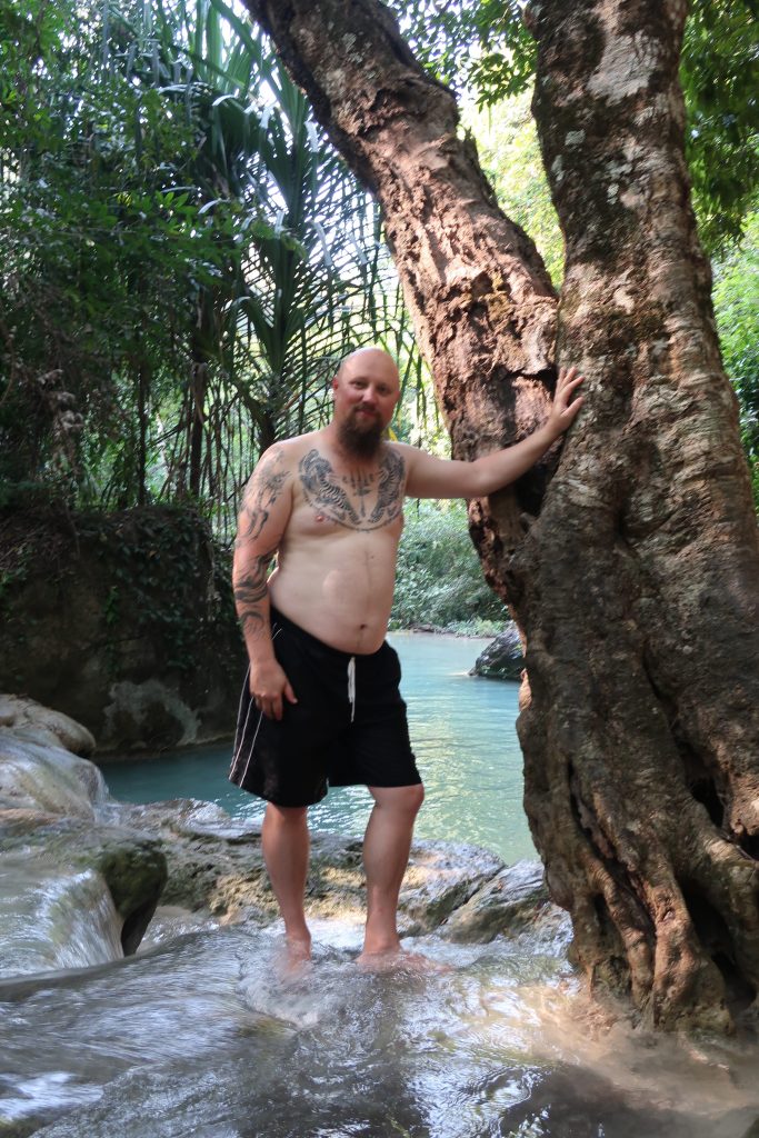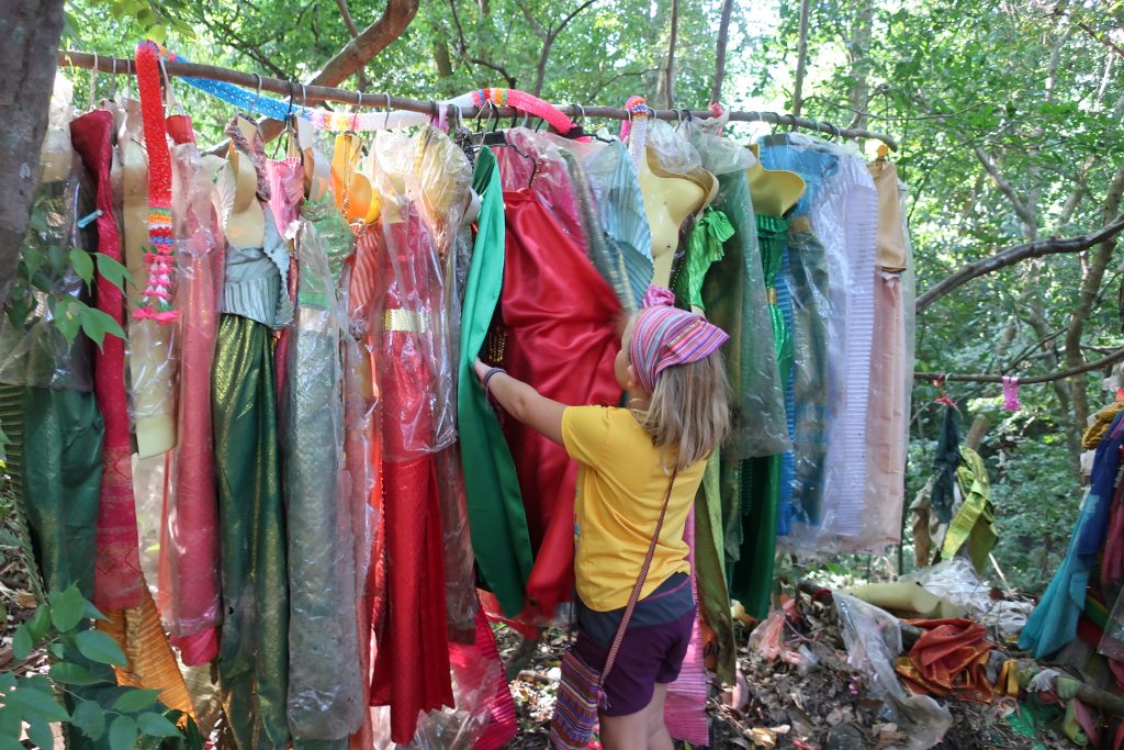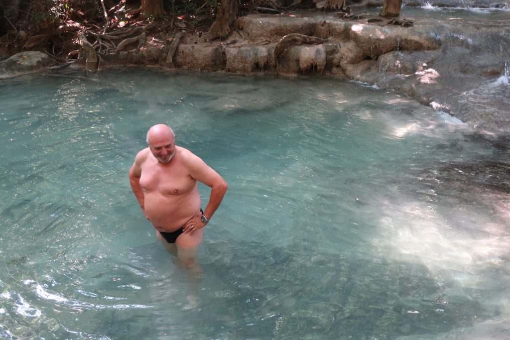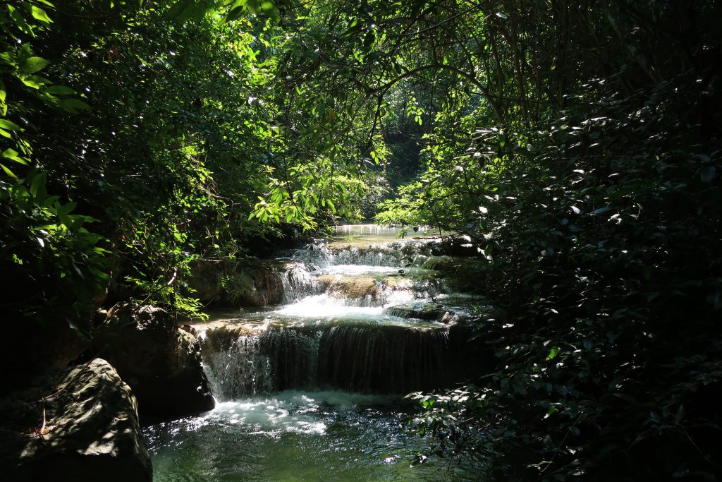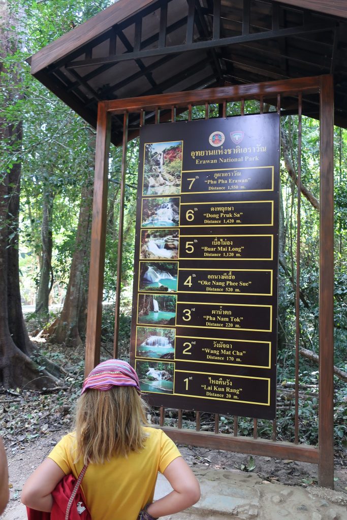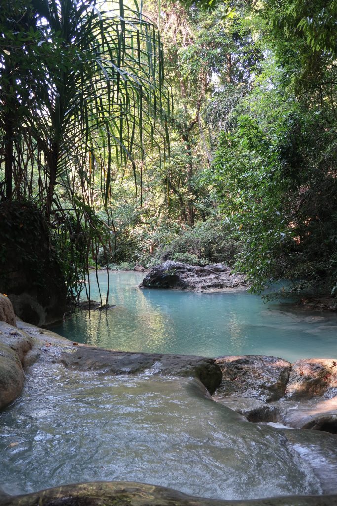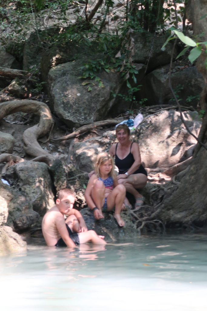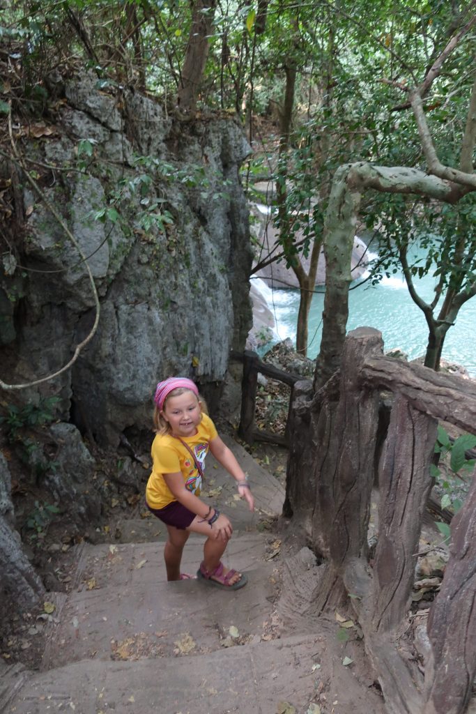Daarna trokken we naar de mooiste watervallen die we tot nu toe gezien hebben: de Erawan Waterfalls. Vooral de prachtige kleur van het helderblauwe water tussen het groene woud kan ons bekoren. De waterval bestaat uit zeven verdiepingen die we te voet naar boven moeten klimmen. Het is er redelijk druk, maar toch vind je er rustige plekjes waar je helemaal alleen kan zijn. Op de vijfde verdieping pauzeren we om te zwemmen. In het begin durven we niet goed in het water, want er komen onmiddellijk visjes aan onze voeten bijten. Die visjes eten enkel dode huidcellen en zijn dus eigenlijk wel heel goed voor de huid, maar het voelt toch wat raar. We klimmen op de rotsen door het water. Zalig!