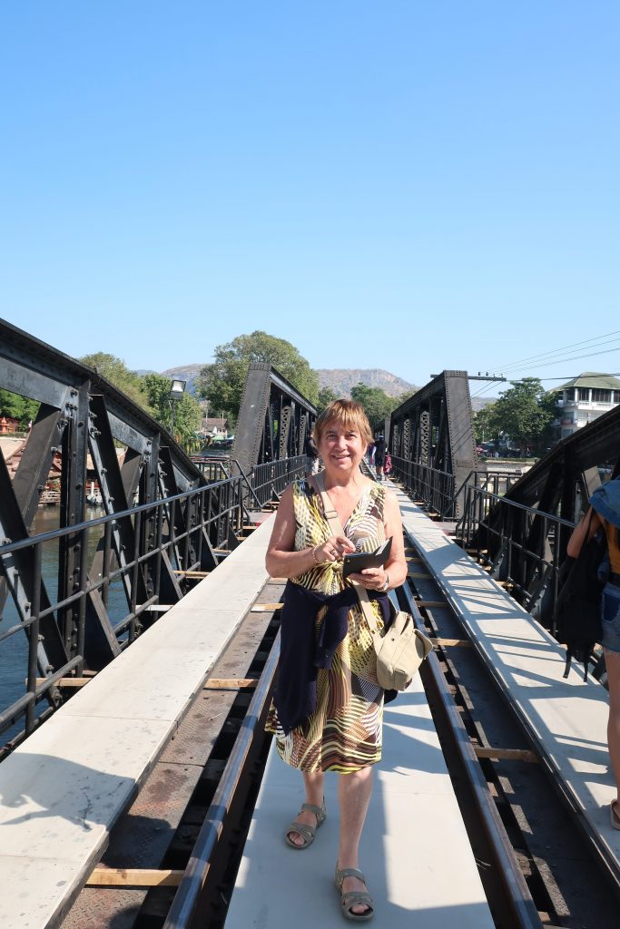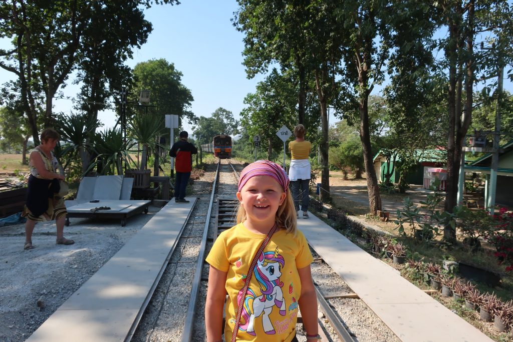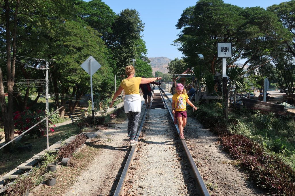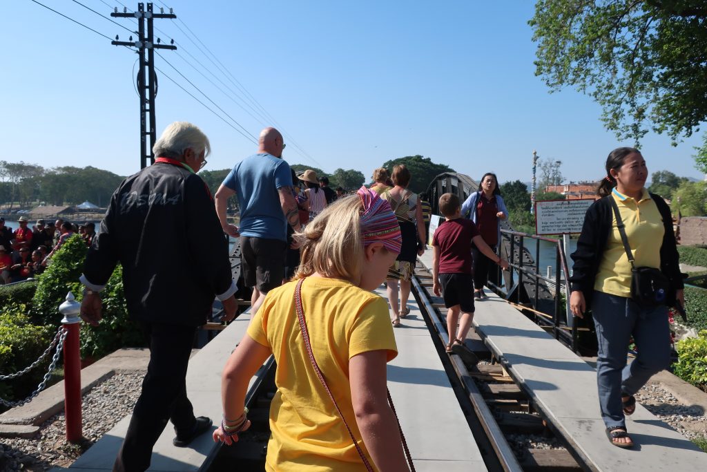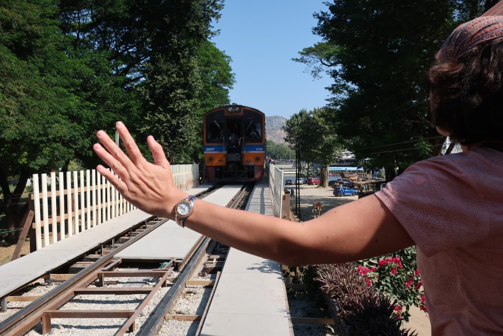 Daarna trekken we nog naar de beroemde “bridge over the river Kwai”, misschien gekend uit de gelijkaardige film, in Kanchanaburi. Hier zijn tijdens de tweede wereldoorlog heel wat gevangenen gesneuveld tijdens het bouwen van de brug. Tijdens de oorlog is de spoorweg over de brug nooit afgeraakt maar nu is er wel een spoorweg waar een toeristische trein over rijdt. Hier mag, moet je zelfs, over de spoorweg lopen om de overkant te bereiken. De trein toetert naar foto-trekkende toeristen tot ze uit de weg gaan.