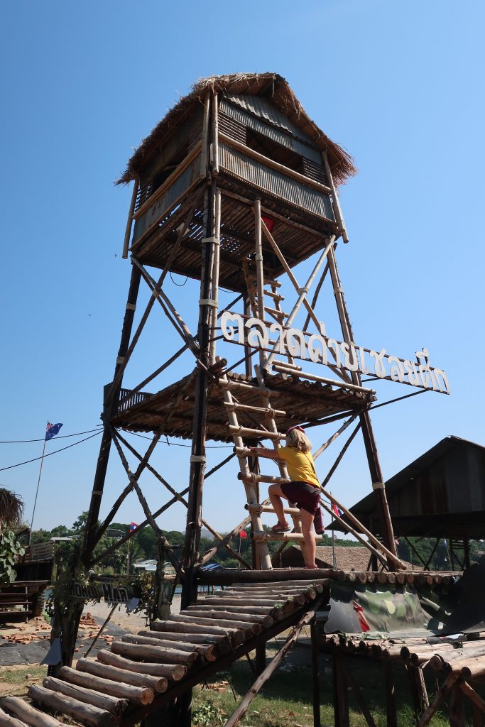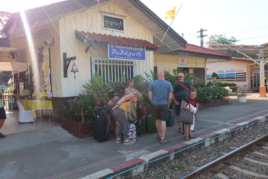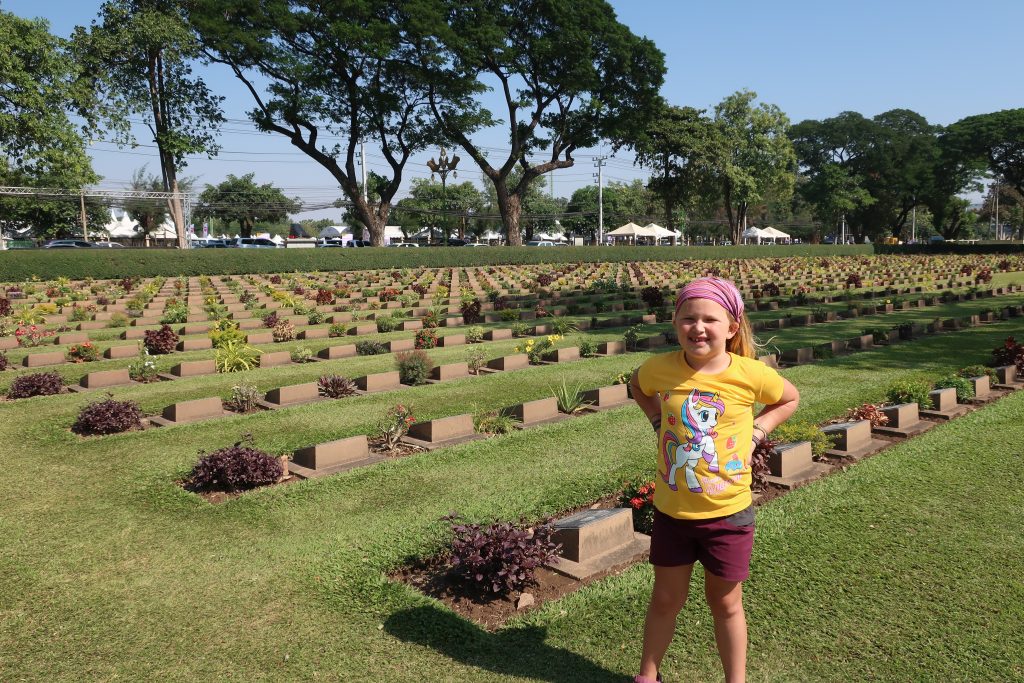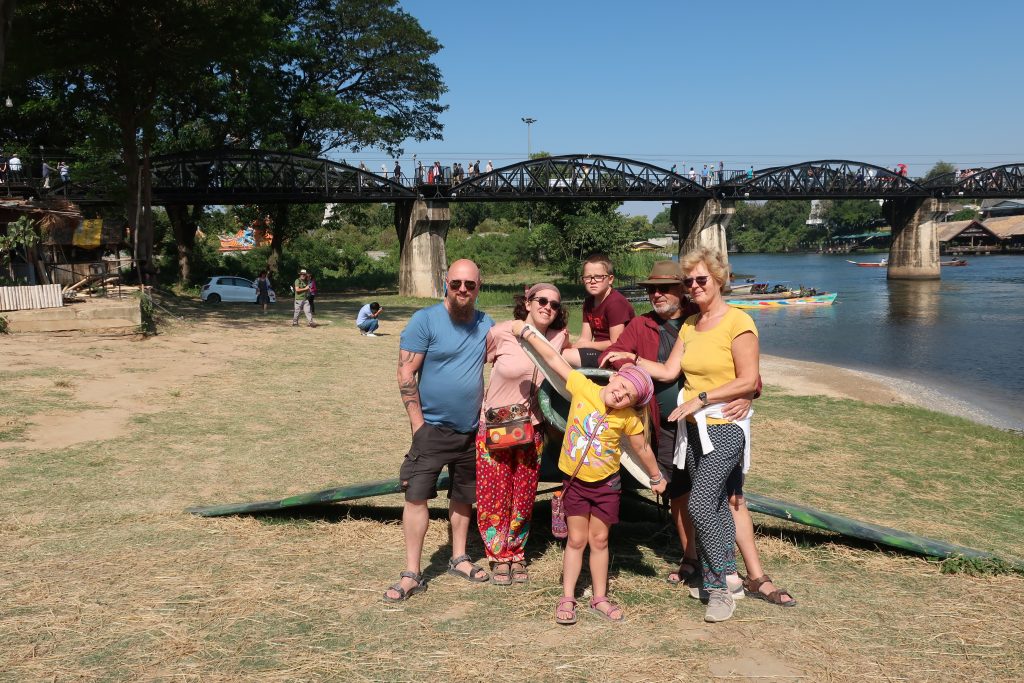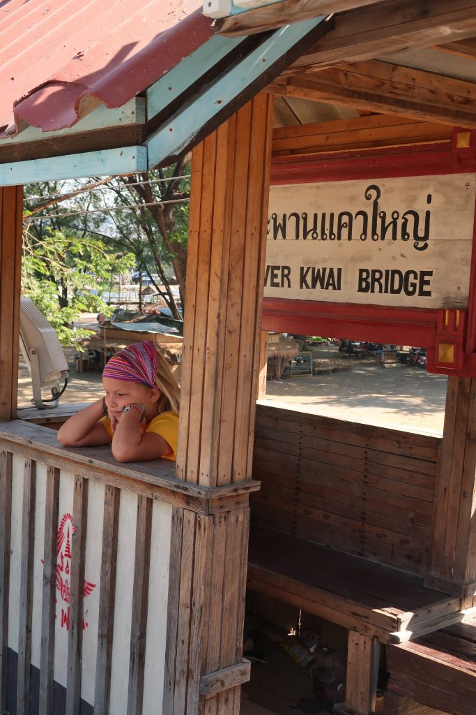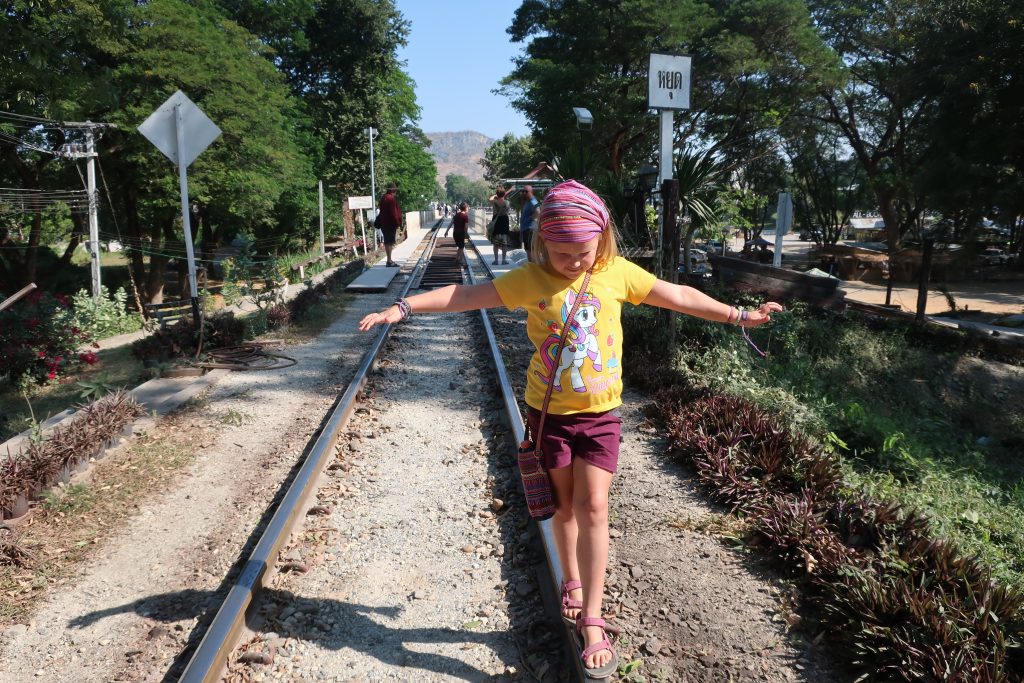 Daarna trekken we nog naar de beroemde “bridge over the river Kwai”, misschien gekend uit de gelijkaardige film, in Kanchanaburi. Hier zijn tijdens de tweede wereldoorlog heel wat gevangenen gesneuveld tijdens het bouwen van de brug. Tijdens de oorlog is de spoorweg over de brug nooit afgeraakt maar nu is er wel een spoorweg waar een toeristische trein over rijdt. Hier mag, moet je zelfs, over de spoorweg lopen om de overkant te bereiken. De trein toetert naar foto-trekkende toeristen tot ze uit de weg gaan.