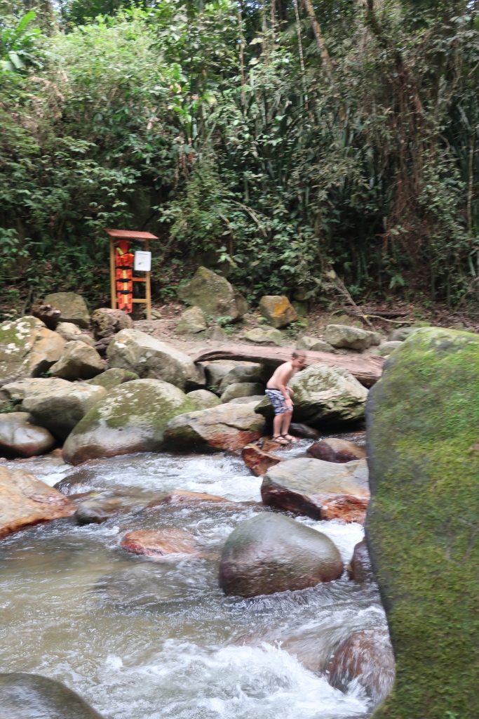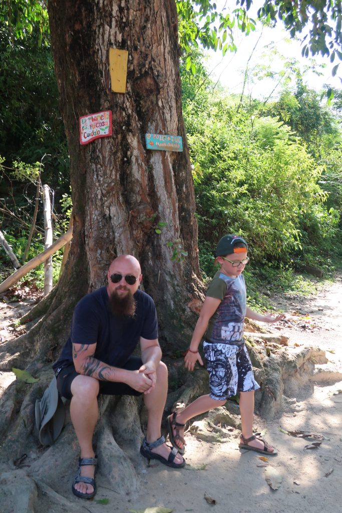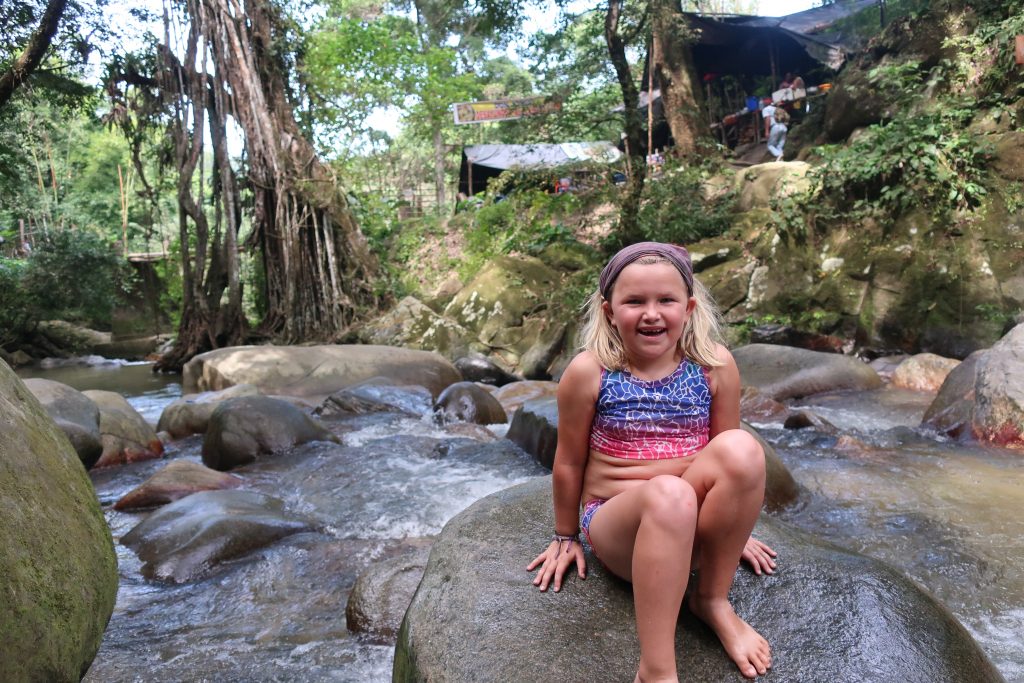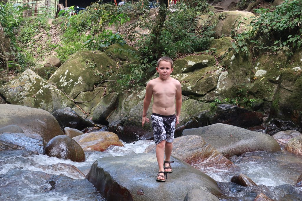 De eerste dag begonnen we met een prachtige wandeling langs bospaadjes naar Pozo Azul, een mooie waterval waar we konden zwemmen. Op het bordje vlak bij ons huisje stond aangegeven dat het een wandeling was van 45 minuten. Ik denk dat de Colombianen snelwandelaars zijn, want wij deden er toch anderhalf uur over… Gelukkig konden we onderweg iets lekkers drinken en onze waterflessen bijvullen! De watervallen waren niet zo spectaculair als die in Thailand, maar een verfrissende duik deed wel deugd! Kiran amuseerde zich met van de ene rotsblok naar de andere te springen en zo de overkant te bereiken. De terugweg langs hetzelfde pad duidde 90 minuten aan, hoewel het nu bergaf was in plaats van bergop. De tijdsberekening bij de Colombianen zit precies nog niet helemaal goed, ofwel hebben ze de pijltjes gewoon omgewisseld…. Na de wandeling belanden we alweer in het zwembad. We hebben hier geen internet en eigenlijk maar goed, want zo maken we meer tijd om te spelen en te lezen. ‘s Avonds trekken we toch naar een restaurantje waar “free wifi” op de menukaart staat. Je weet nooit wat er in het thuisland ondertussen kan gebeurd zijn en zo kunnen we ook nog wat stoefen met mooie foto’s die we naar het thuisfront sturen.