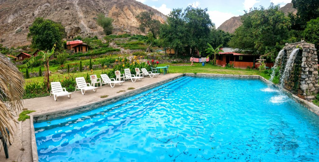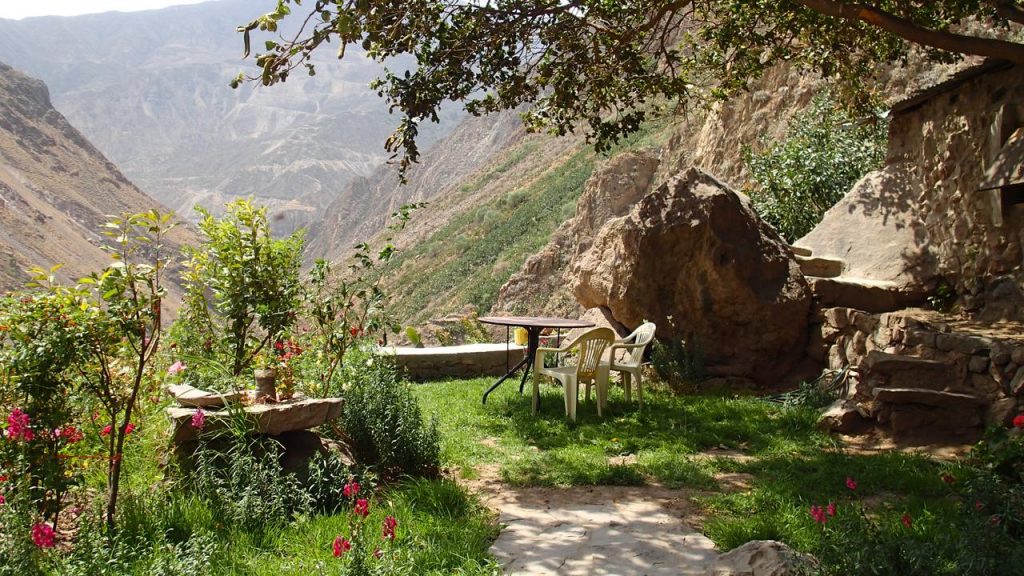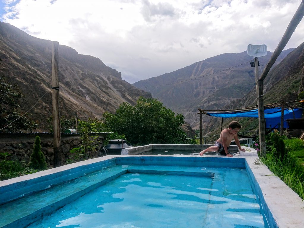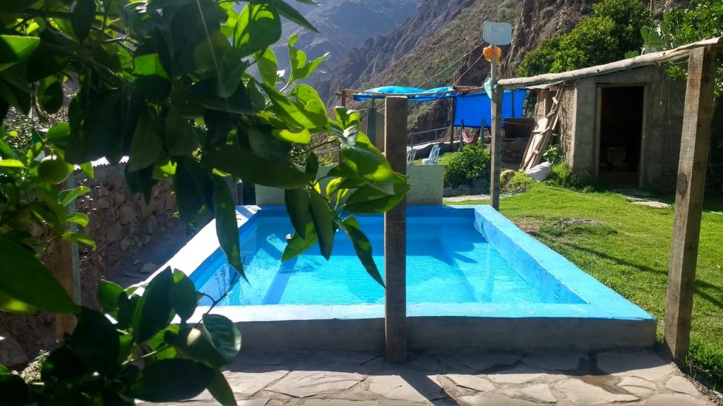 De eerste dag trekken we naar Llahuar. Een plekje in de kloof dat gekend is om zijn warmwaterbronnen. Het wordt een gemakkelijke wandeling want vandaag is het bijna enkel bergaf. Dat dachten we! Het pad gaat stijl naar beneden en bestaat uit kiezeltjes en losliggende stenen en dat is superlastig! We voelen het ferm in onze benen en zijn doodop. Gelukkig belanden we in een supergezellig guesthouse met zwembad en waar je het fruit gewoon van de bomen mag trekken! Het zwembad heeft een warm gedeelte (wordt gevuld door de warmwaterbron) en een koud gedeelte. Het is er heerlijk vertoeven met een boekje in de hangmat! We hebben het hotel helemaal voor ons alleen! Ze hebben er ook gezelschapsspelletjes om de tijd te verdrijven en dus wagen we ons ‘s avonds aan een spelletje Monopoly bij kaarslicht. Er is immers geen elektriciteit. Tijd genoeg om het spel uit te spelen, hebben we niet. We kruipen op tijd in ons bedje want het wordt morgen nog een zware dag.
