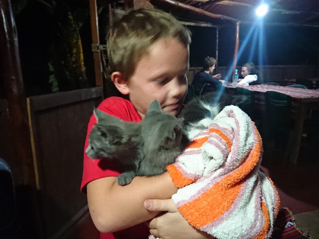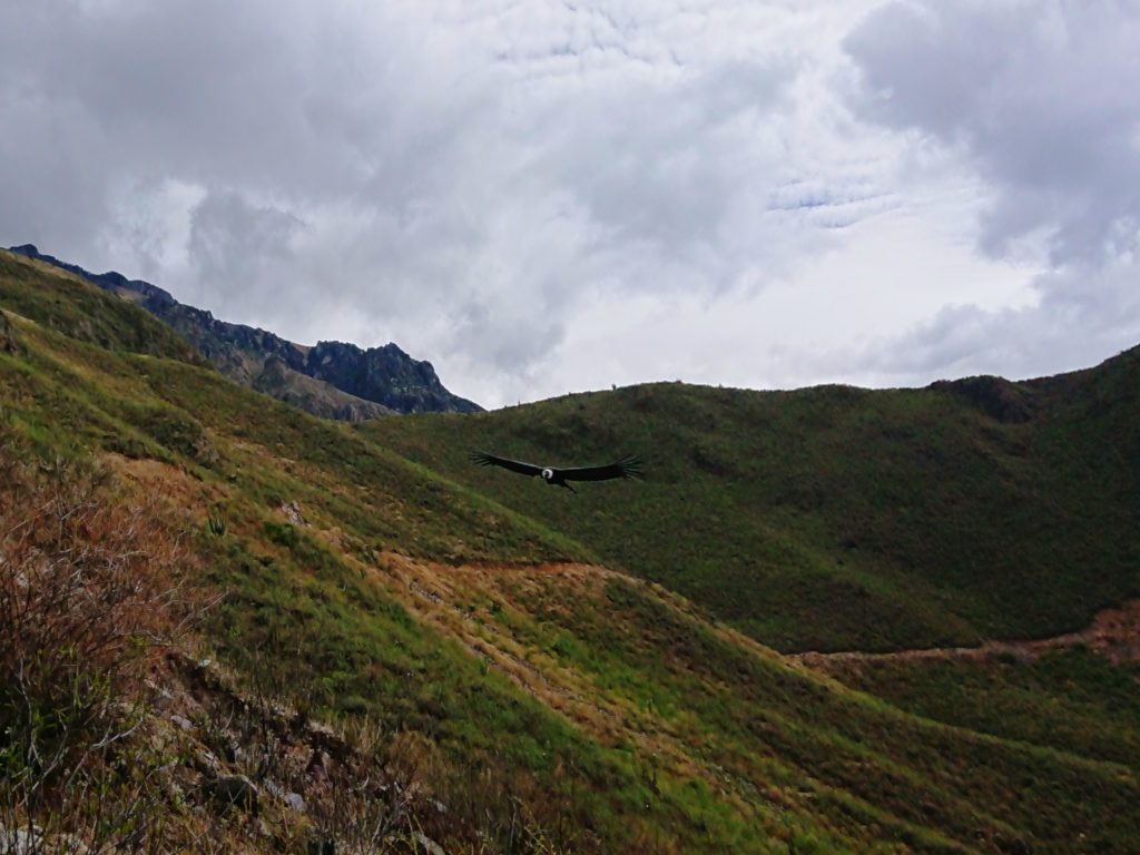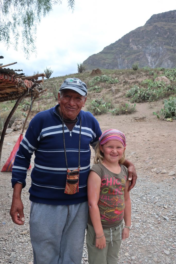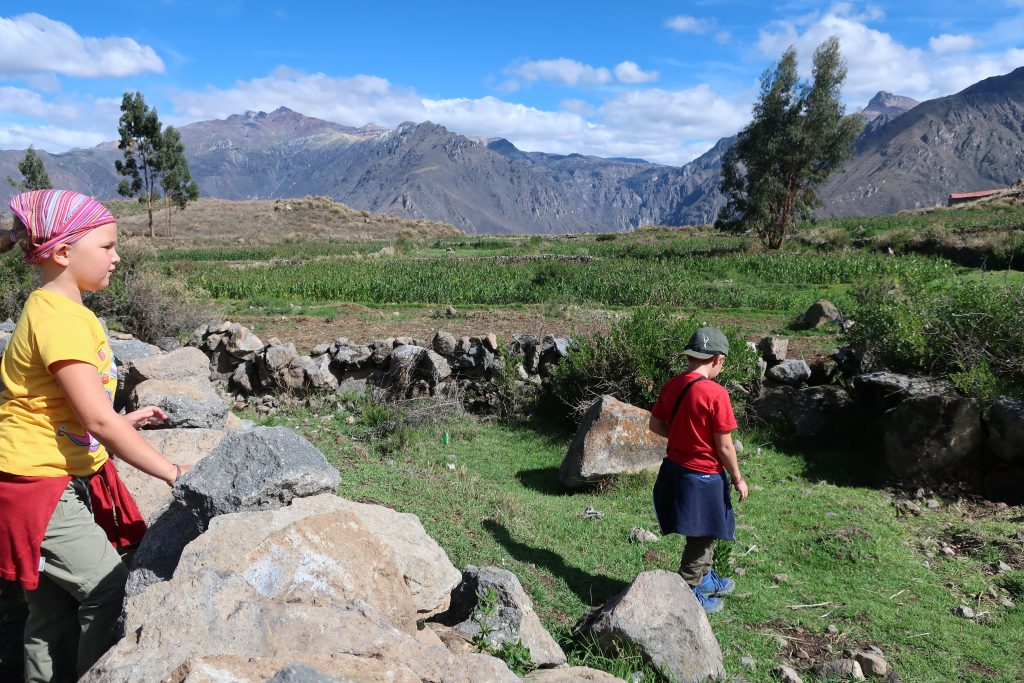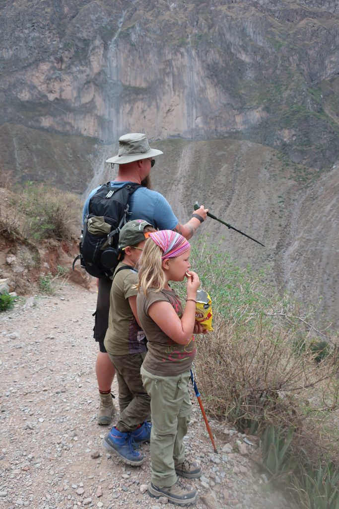 Dag twee staat de zwaarste wandeling op het programma. We moeten immers een berg oversteken om ‘s avonds opnieuw vlak bij de rivier aan te komen. Toen we de vorige namiddag oververmoeid en uitgedroogd in het dorpje Turuña aankwamen bij een kraampje met drinken vonden de plaatselijke twee vrouwtjes dat onze kinderen er nogal afgepeigerd uitzagen. (Ze zagen rood omdat we ons vergeten insmeren waren met zonnecrème.) Ze vonden het onvoorstelbaar dat wij die hele afdaling al met onze kinderen gedaan hadden. Ze informeerden ons dat er dagelijks om 8u30 een bus naar boven ging. Die kans lieten we niet liggen, en dus stonden we de volgende dag, na eerst een half uur klimmen, ruim op voorhand (we wilden die bus echt niet missen) aan de busstop. We lieten ons tot aan het uitkijkpunt “Mirador de Apacheta” brengen (dat scheelde toch alweer vier kilometer) en zetten vanaf daar onze wandeling verder naar Sangalle. De wandeling ging alweer bergafwaarts, maar gelukkig niet meer zo stijl als gisteren. Wanneer we nog maar net vertrokken zijn, vliegen twee condors ons voorbij. Prachtig! We zien de groene oase waar we ‘s avonds zullen verblijven al van ver liggen en we zien ook de stijle bergwand aan de overkant die we de volgende dag nog op moeten (maar dat zijn zorgen voor later). Onderweg komen we nog een vriendelijk mannetje tegen dat water, chips en koekjes verkoopt. Deze keer hebben we meer dan genoeg water mee, maar we kopen alvast enkele zakjes chips. Beneden zou alles veel duurder zijn volgens hem (en hij had groot gelijk, merken we achteraf). Gelukkig komen we opnieuw aan in een wondermooi hotel! De kamers zijn basic, de badkamer vies, maar er is een prachtige tuin met zwembad met waterval. Wat wil een mens nog meer na een lange dag wandelen? Bovendien blijkt er een hele nest jonge katjes te zijn. Het plezier voor de kids kan niet meer op!
