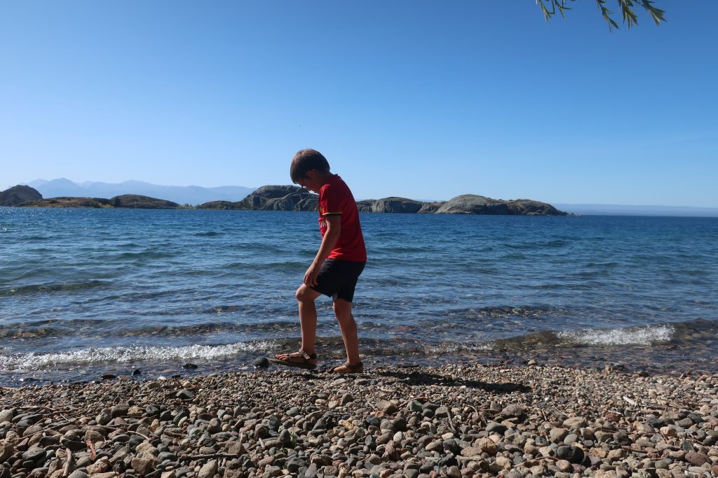 Bij aankomst in Los Antiguos, zien we het busje van Martin Pescador al klaar staan. Bernie schiet zich naar het kantoortje (er stappen hier immers nog veel mensen af) terwijl ik mij om de kinderen bekommer. Helaas, er is maar één plaatsje meer vrij op het busje (blijkbaar zijn er toch mensen in geslaagd om dit op voorhand te boeken), maar we kunnen nog reserveren voor het busje vier uur later. Gelukkig mogen we de bagage in het kantoortje laten staan en dus trekken we het boerengat in. Veel valt er hier niet te beleven, maar we vinden toch een cafeetje met terras waar we een warme chocomelk drinken en spelletjes spelen en zo vliegt de tijd toch een beetje voorbij. Er is nog een lokale markt waar we frambozen kopen (die we nog heel snel moeten opeten want je mag geen fruit de grens over nemen) en staan mooi op tijd opnieuw in het busstation. Al het gedoe aan de grens gaat vlot want Martin Pescador kent de ambtenaren aan de grens allemaal heel goed en als hij vertelt dat we bij hem horen, mogen we direct verder.