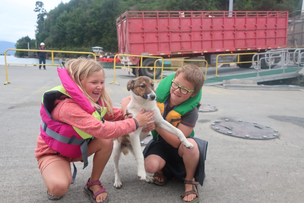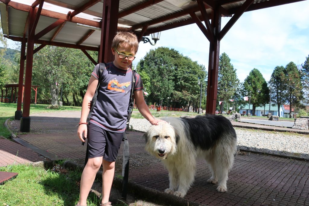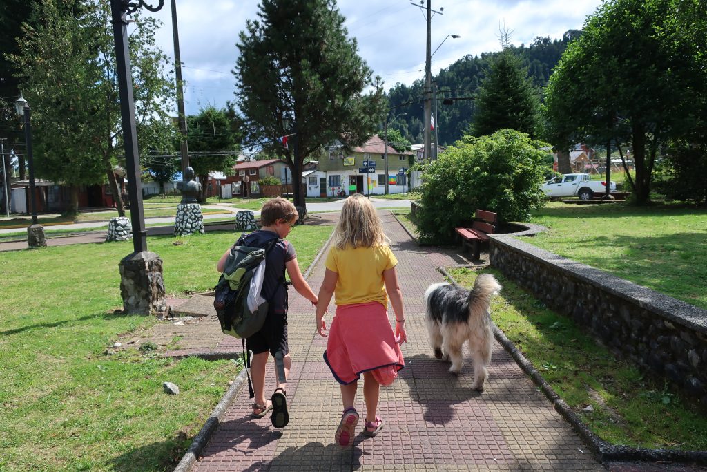 Ten slotte bereiken we Chaitén, voor ons het einde van de Carretera Austral. Van hieruit nemen we de volgende dag de overzetboot naar Chiloé. We moeten al heel vroeg in de ochtend de bus nemen en mogen bij aankomst nog niet in ons huisje. We boeken ons dan maar een dagtrip. Of beter gezegd: we wachten aan een kantoortje waar je dagtrips kan boeken, tot het busje aankomt, iedereen opstapt en de organisator tegen ons zegt “kom er maar bij”. Er is eigenlijk maar één plekje meer vrij, maar de kinderen moeten maar op de schoot en Bernie op een melk kratje. We weten eigenlijk niet goed waar het busje heen gaat, maar gelukkig zit er een koppel walen op de bus die onze bezorgdheden verstaat en ons van uitleg voorziet. We laten de chauffeur nog vlug stoppen aan een winkeltje want we zijn niet zoals de anderen voorzien van een picnic. Tjah, familie ongeregeld is opgestapt…