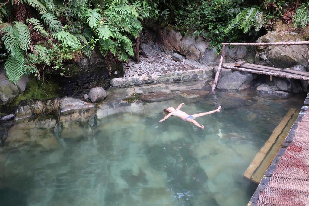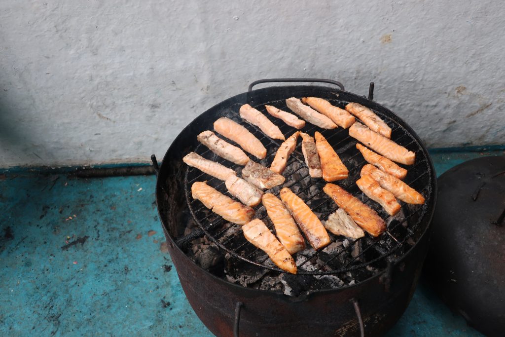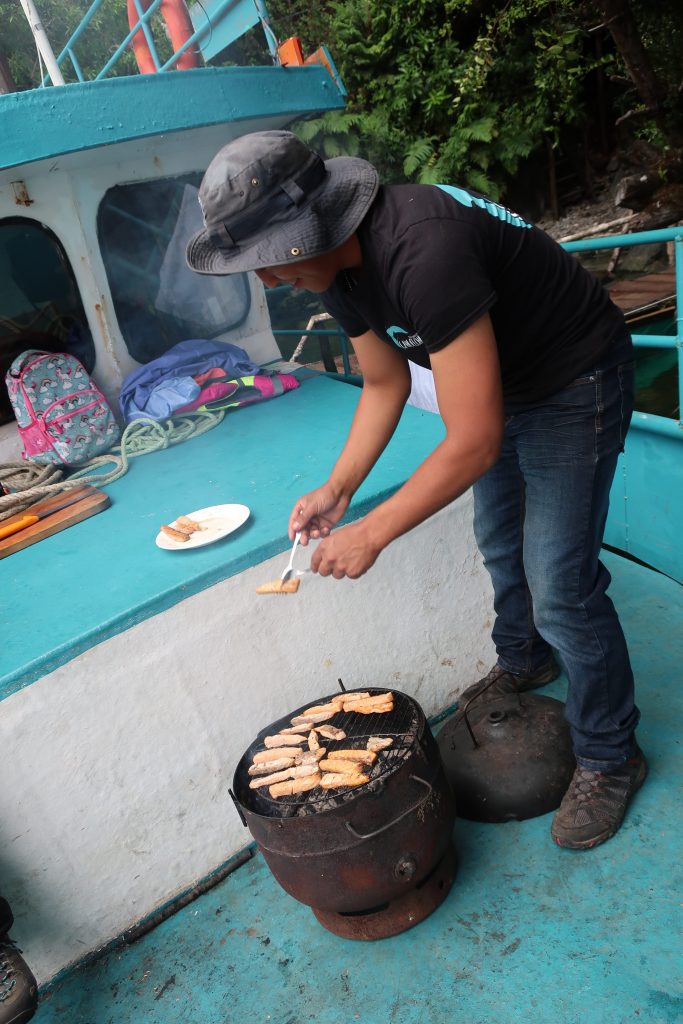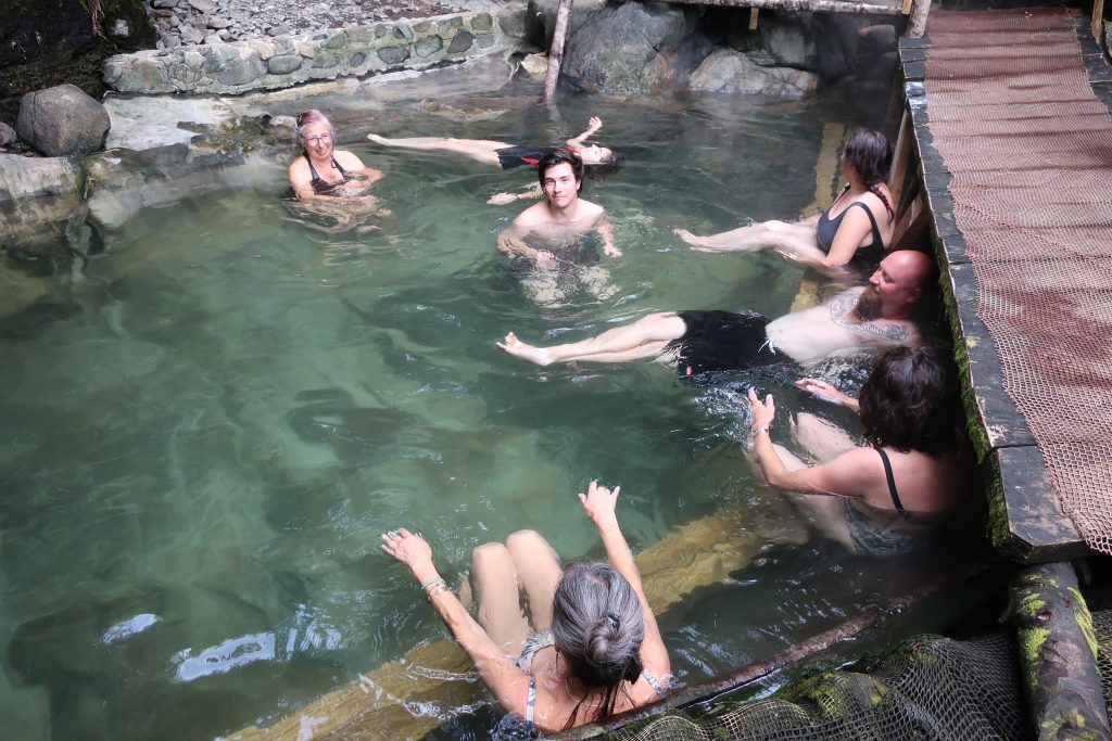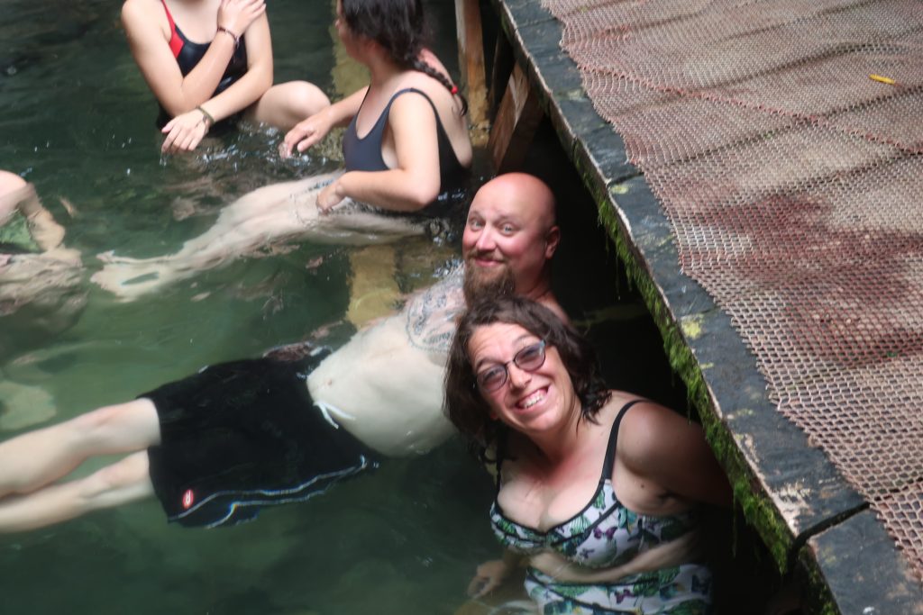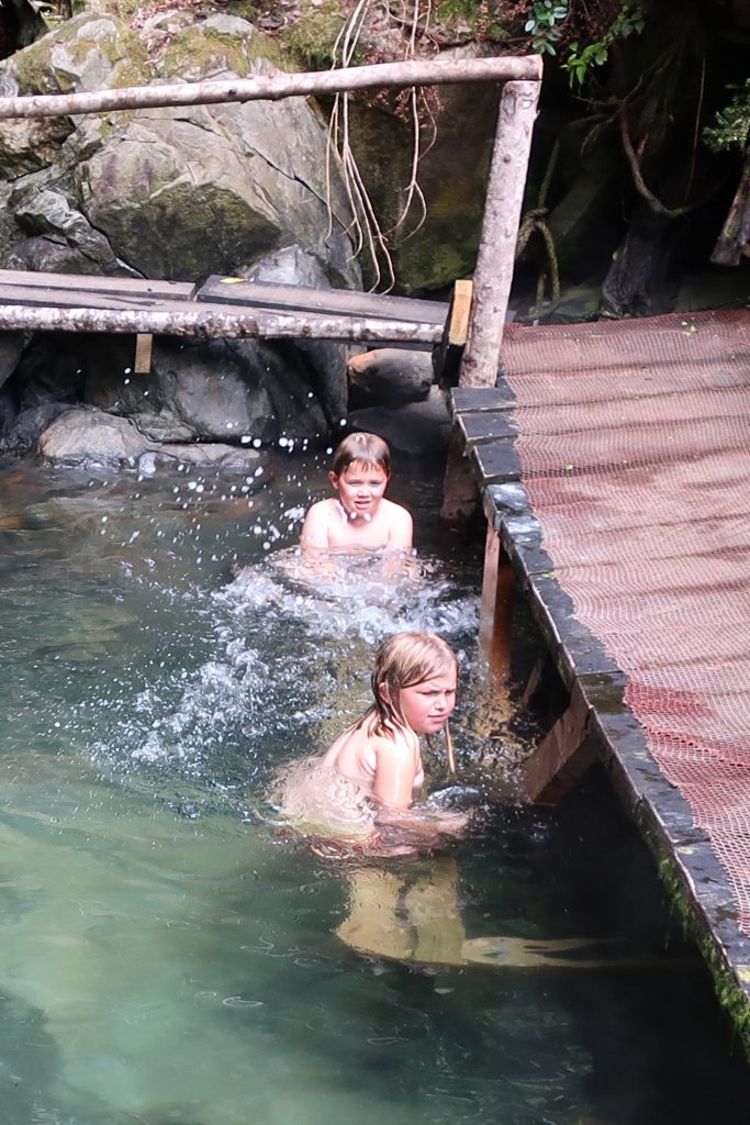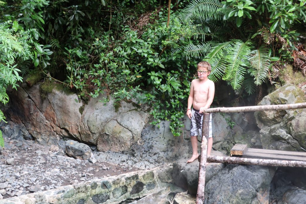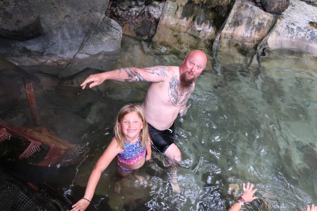 Onze eerste stop is een warmwaterbron. Het water heeft er op die plaats zo warm dat we de hele tijd het water moeten mixen met koud water om niet te verbranden. Zalig zo’n lekker warm badje. We komen er pas uit als het eten klaar is, want de schipper heeft heerlijke zalm op de BBQ liggen! Kiran en Tika krijgen het eerste hapje en springen daarna weer in het bad. Nu hebben ze het bad voor hun alleen en mogen ze lekker spetteren!