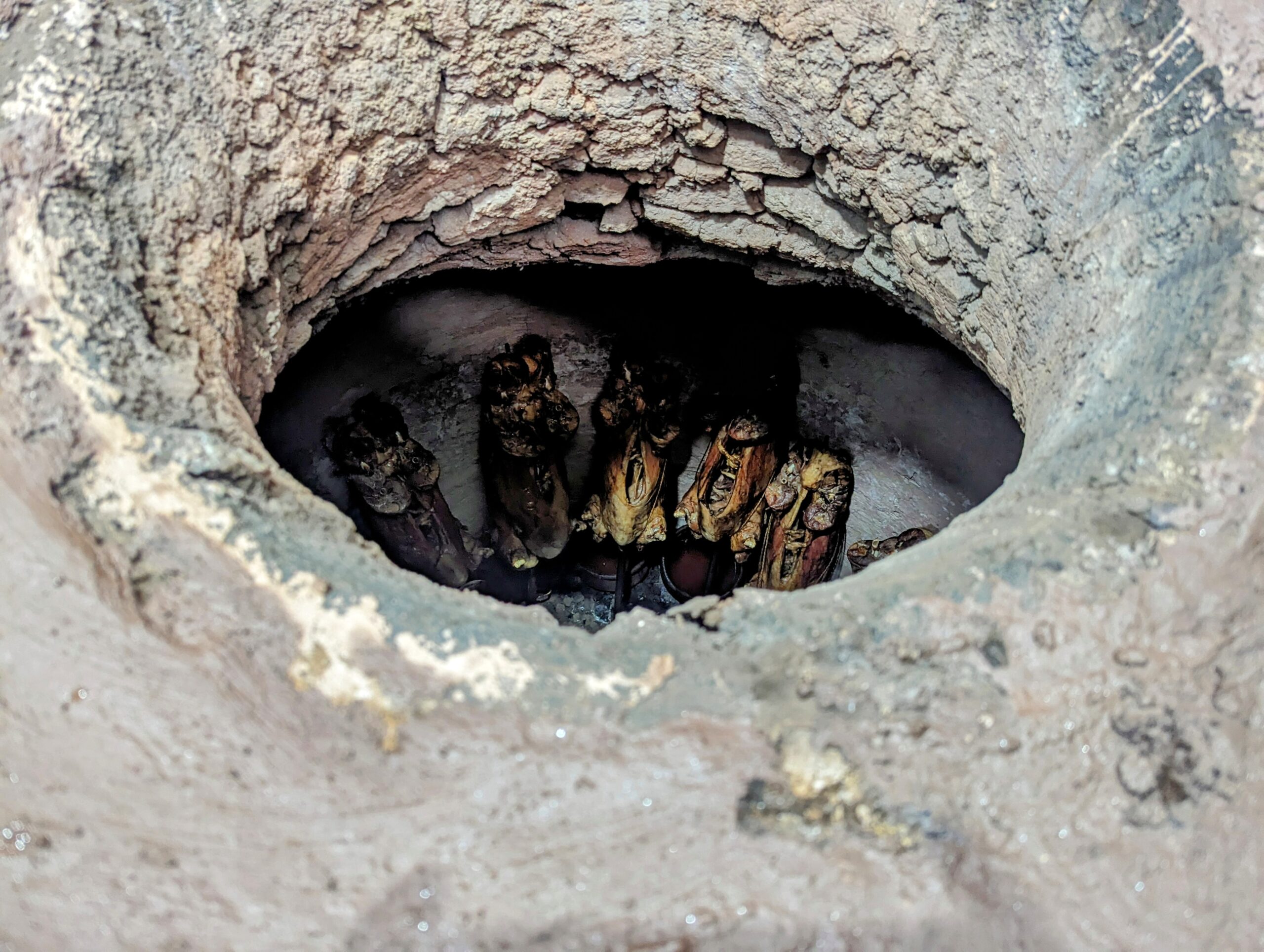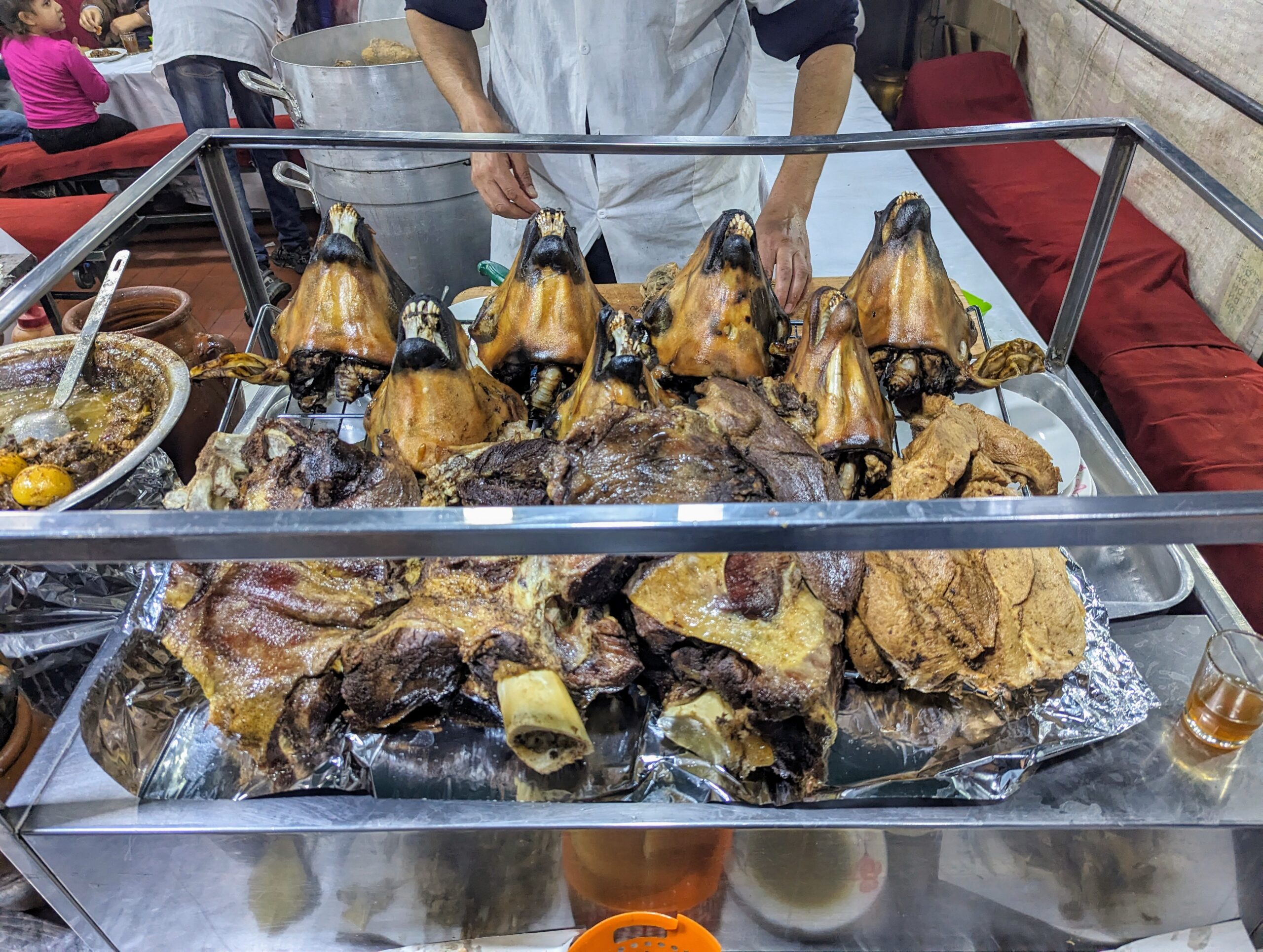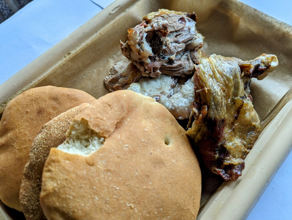 Heerlijke méchoui eten. (In een put traag gerookt lamsvlees.)